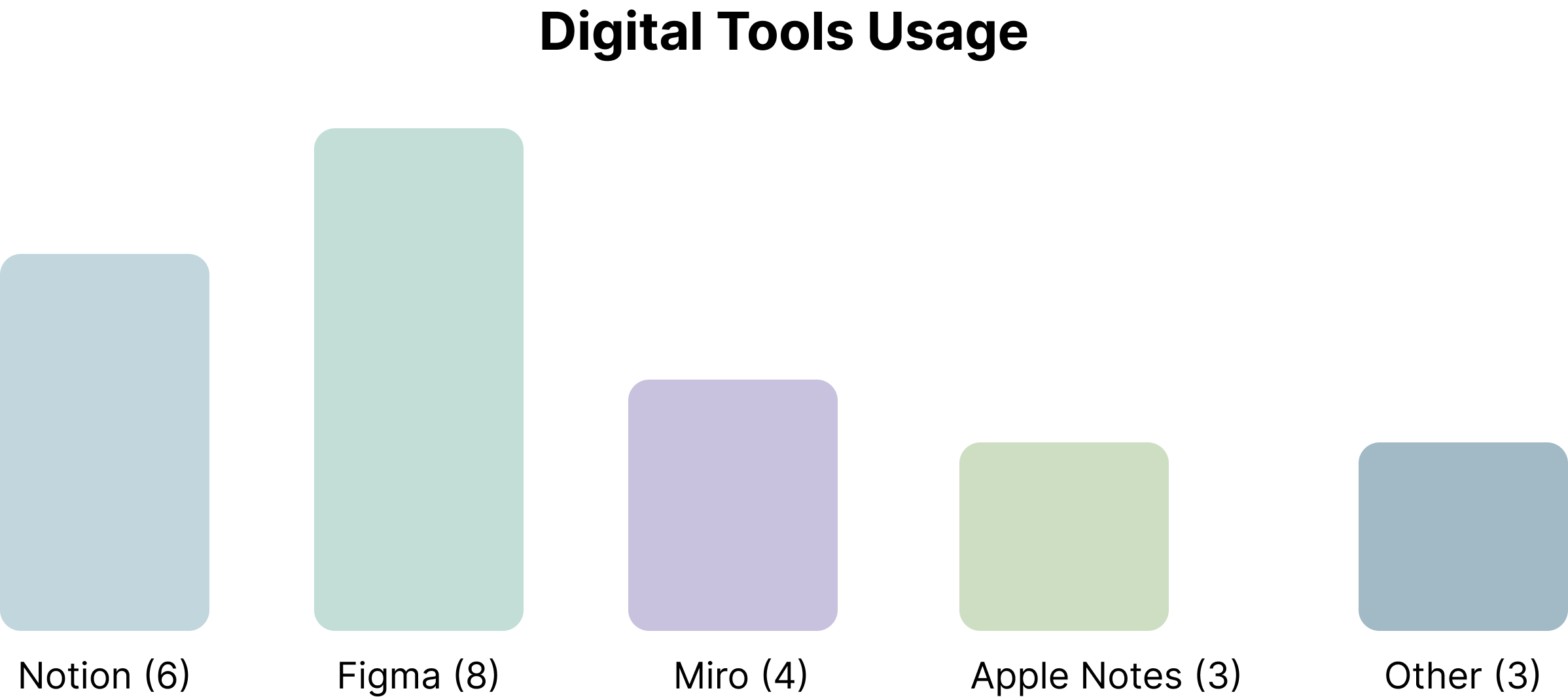 Only a third of designers use exclusively digital tools. Among digital tools, Figma, Notion, Miro, and interestingly, Apple Notes emerged as the most popular choices, with designers appreciating their versatility and ease of use.
